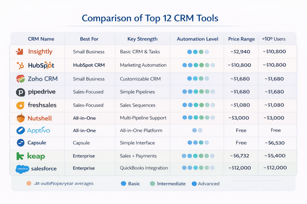 In this article, we compare the 12 best Insightly alternatives available today. These CRM platforms were selected based on real buyer priorities, not vendor marketing claims. We’ll break down how each option compares in terms of features, pricing transparency, automation power, scalability, and critically how easy it is to migrate away from Insightly without disrupting your business.